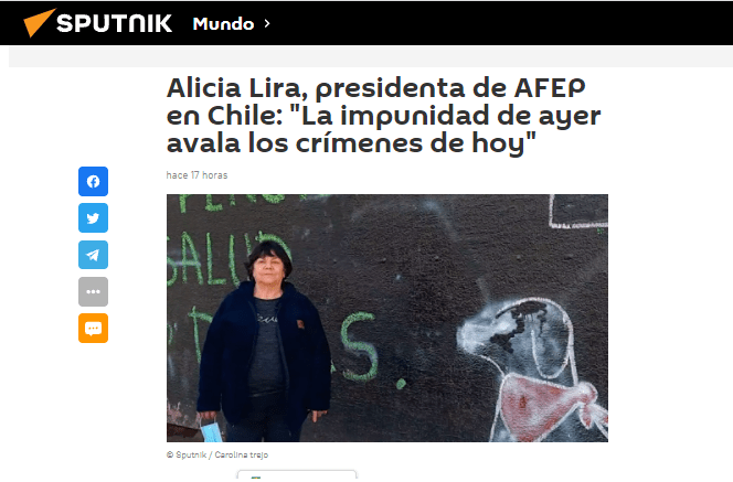 Con 73 años Alicia Lira Matus lleva la mitad de su vida luchando para que la verdad, la justicia y la no repetición de los crímenes de lesa humanidad se impongan en el país sudamericano. Una labor que se hizo más urgente tras los abusos y delitos cometidos nuevamente por agentes del Estado durante la revuelta social iniciada en octubre de 2019.