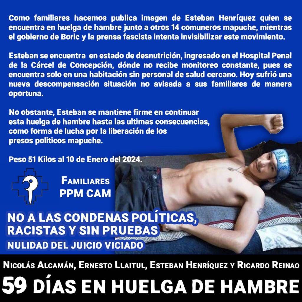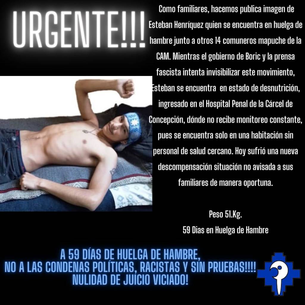 Denunciamos ante el movimiento de derechos humanos de todo el mundo y las organizaciones internacionales encargadas del cumplimiento de los Pactos y Convenios correspondientes; que el estado de salud de los cuatro presos comuneros mapuche en huelga de hambre hace 61 días, se ha desmejorado. Es especialmente grave el estado de Esteban Henríquez cuyos médicos solicitan traslado al Hospital Regional de Concepción para su control eficaz, lo cual ha sido negado hasta ahora por el Estado Chileno al cual hacemos responsable de la vida de Esteban Henríquez y demás compañeros. En defensa de la vida y en reclamo de la libertad de los presos comuneros mapuche.