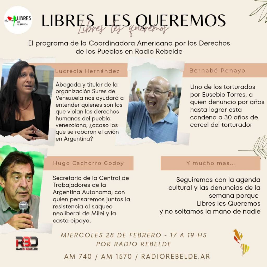 Libres Les Queremos – Un programa para dar voz a los presos y perseguidos políticos de todas las Américas. Coordinadora Americana por los Derechos de los Pueblos @CADP_DH En @Am740Rebelde | Desde Febrero | Todos los Miércoles de 17 a 19 Hs |