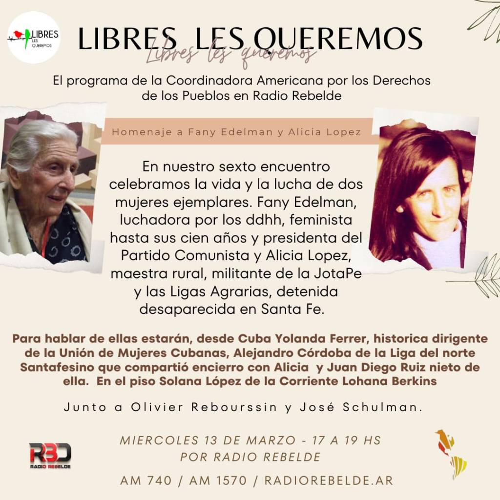 Las y los invitamos a acompañarnos y escuchar el Programa «Libres Les Queremos» de la Coordinadora Americana por los Derechos de los Pueblos en Radio Rebelde @LibresLesRadio En @Am740Rebelde | Todos los Miércoles de 17 a 19 Hs |