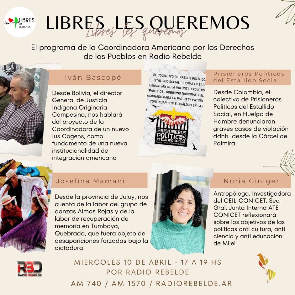 Las y los invitamos a acompañarnos y escuchar el Programa «Libres Les Queremos» de la Coordinadora Americana por los Derechos de los Pueblos en Radio Rebelde @LibresLesRadio En @Am740Rebelde | Todos los Miércoles de 17 a 19 Hs | – Escúchanos por http://Radiorebelde.ar