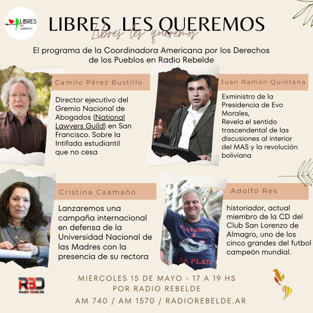 Las y los invitamos a acompañarnos y escuchar el Programa «Libres Les Queremos» de la Coordinadora Americana por los Derechos de los Pueblos en Radio Rebelde @LibresLesRadio En @Am740Rebelde | Todos los Miércoles de 17 a 19 Hs | – Escúchanos por http://Radiorebelde.ar