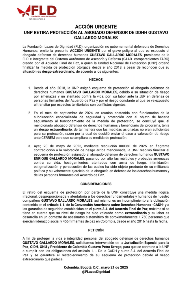 La Fundación Lazos de Dignidad (FLD), organización no gubernamental defensora de Derechos Humanos, emite la presente ACCIÓN URGENTE por el grave peligro al que es expuesto el abogado defensor de derechos humanos GUSTAVO GALLARDO MORALES, presidente de la FLD e integrante del Sistema Autónomo de Asesoría y Defensa (SAAD- comparecientes FARC) creado por el Acuerdo Final de Paz, a quien la Unidad Nacional de Protección (UNP) ordenó finalizar la medida de protección otorgada desde el año 2018, a pesar de reconocer que su situación es riesgo extraordinario, de acuerdo a los siguientes: