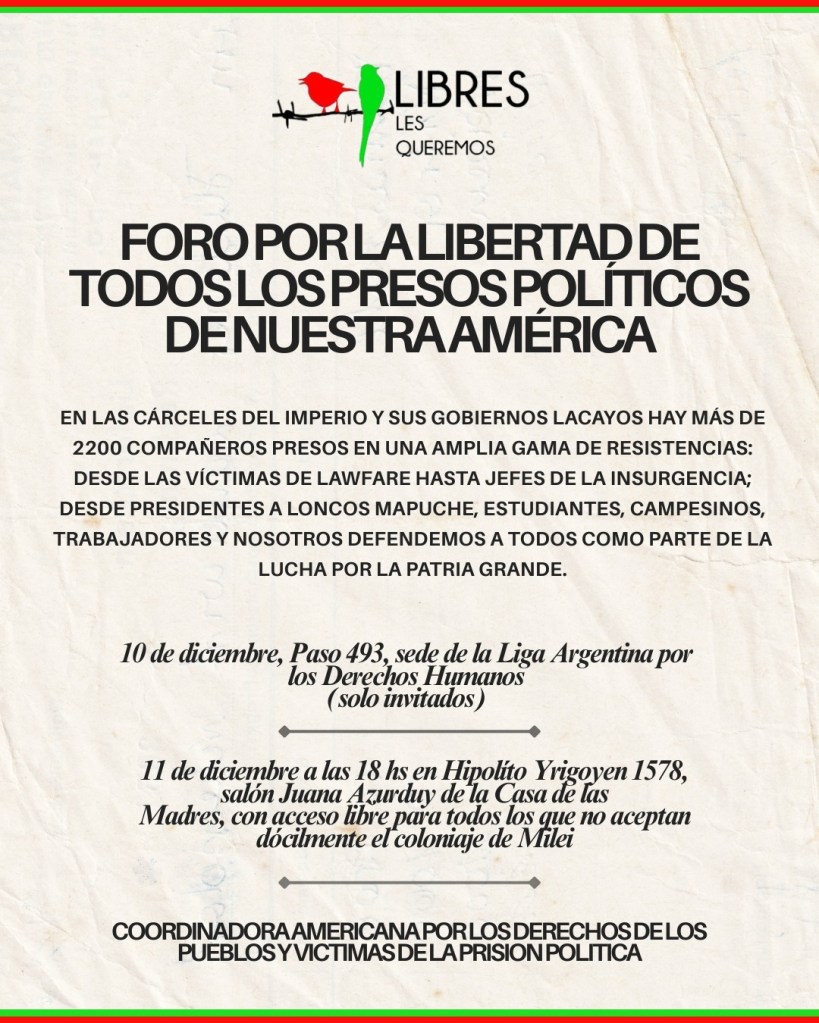 Luchar por la libertad de todas y todos los presos políticos es cuestionar el sistema, superar el individualismo, el sectarismo y el hegemonismo que tanto mal nos hace. *Nadie* suelte la mano de *nadie*. Vea las siguientes actividades del Foro por la libertad de todos los Presos Políticos de nuestra América a realizarse en Argentina: